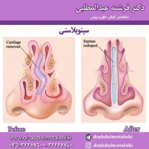 جراحی سپتوپلاستی، یک عمل جراحی است که بر روی سپتوم یا تیغه بینی انجام می شود. برخی از افراد به دلیل مشکلات ارثی یا حادثه، دچار انحراف درسپتوم یا تیغه میانی بینی خود می شوند. یکی از گزینه های پیشنهادی جراحان و متخصصین گوش، حلق و بینی برای درمان این ناهنجاری، جراحی سپتوپلاستی است. سپتوپلاستی با هدف رفع انحراف تیغه میانی بینی مشکلات عملکردی و ظاهری و زیبایی را درمان نموده و تاثیرات ایده آلی را برای بیمار به همراه می آورد . در حالت عادی تیغه میانی بینی یا سپتوم در وسطی ترین بخش بینی جای دارد که فضای مابین دو حفره و دریچه های بینی را تشکیل می دهد در صورت بروز انحراف به هر دلیل این تیغه به یکی از طرفین کج می شود و در شرایط انحراف شدید باعث بروز انسداد و گرفتگی در کانال ها و معابر بینی خواهد شد.